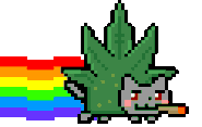 Its body is a Fern Green Pop-Tart with marijuana leaves flowing at the top of the Pop-Tart as it flies through space. It has the original rainbow like the Original Nyan Cat has as it flies through a Royal Purple colored outer space background.