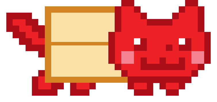 Caramel Nyan KitKat is represented as an 8-bit red cat with pink color on his cheeks and dark red eyes, just like the Classic Nyan KitKat, however, the body instead of consisting of milk chocolate bars, it is instead composed of two caramel KitKat chocolate bars.
