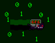 She is a black, fluffy computer-obsessed cat. She has a green and black rainbow trail with flying binary digit icons.